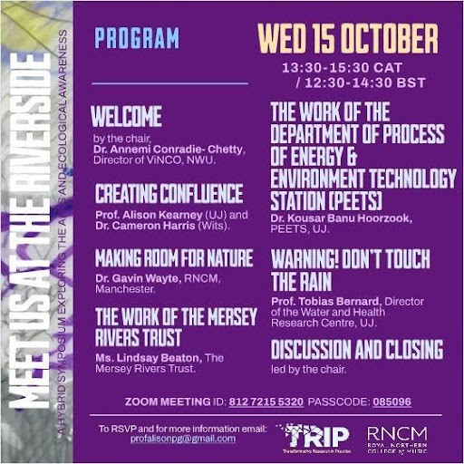 This hybrid seminar explored the role of the arts in eco-critical awareness and activism. Speakers included Dr Cameron Harris (Wits), Dr Gavin Wayte (RNCM) and Prof. Alison Kearney (UJ) who collaborated on an eco-critical sound art installation; Prof. Tobias Bernard (UJ), a bio-chemical engineer who creates bio-art about water pollution; and as well as members of The Mersey Rivers Trust (UK) and Water for the Future (S.A.).