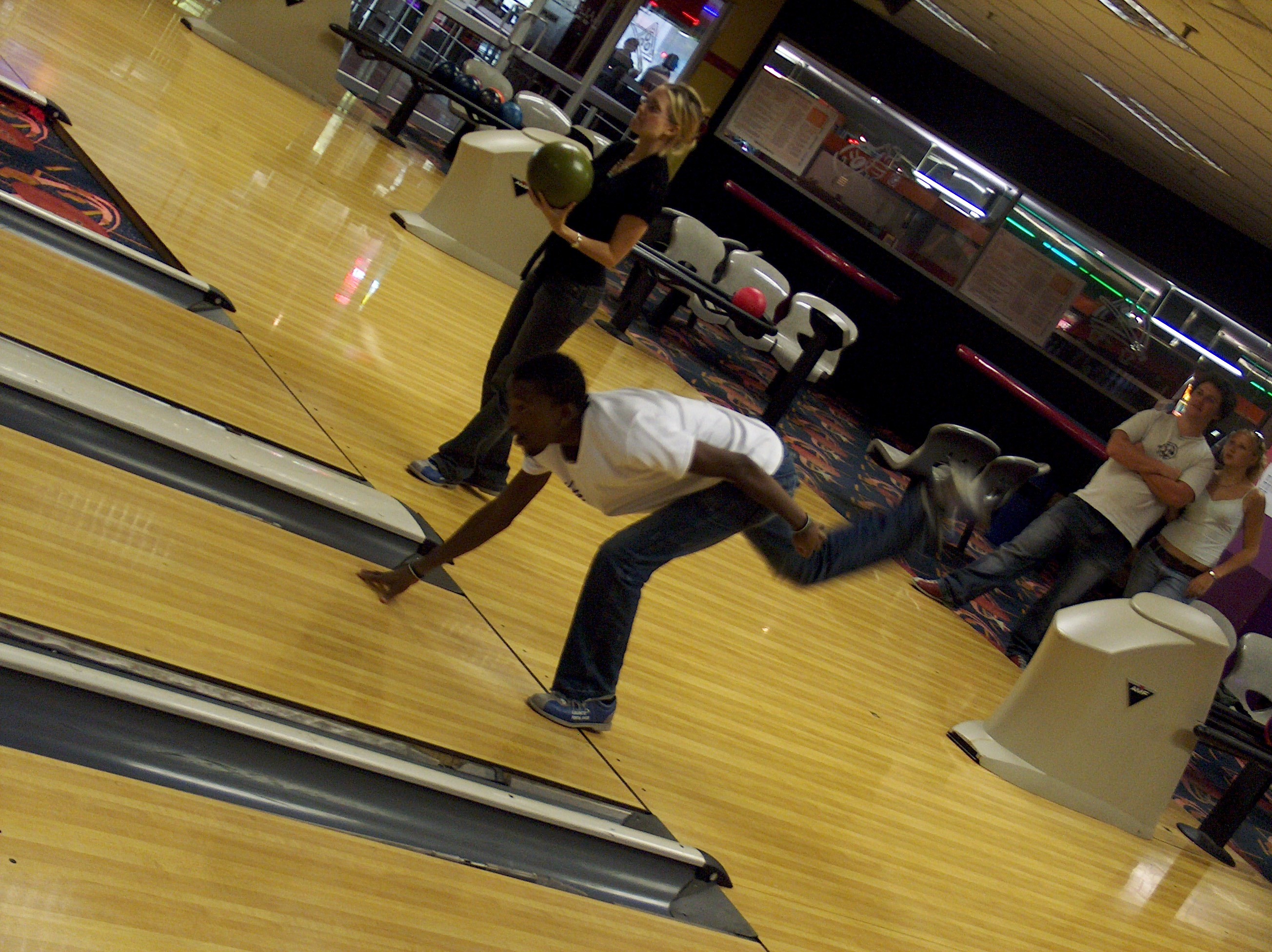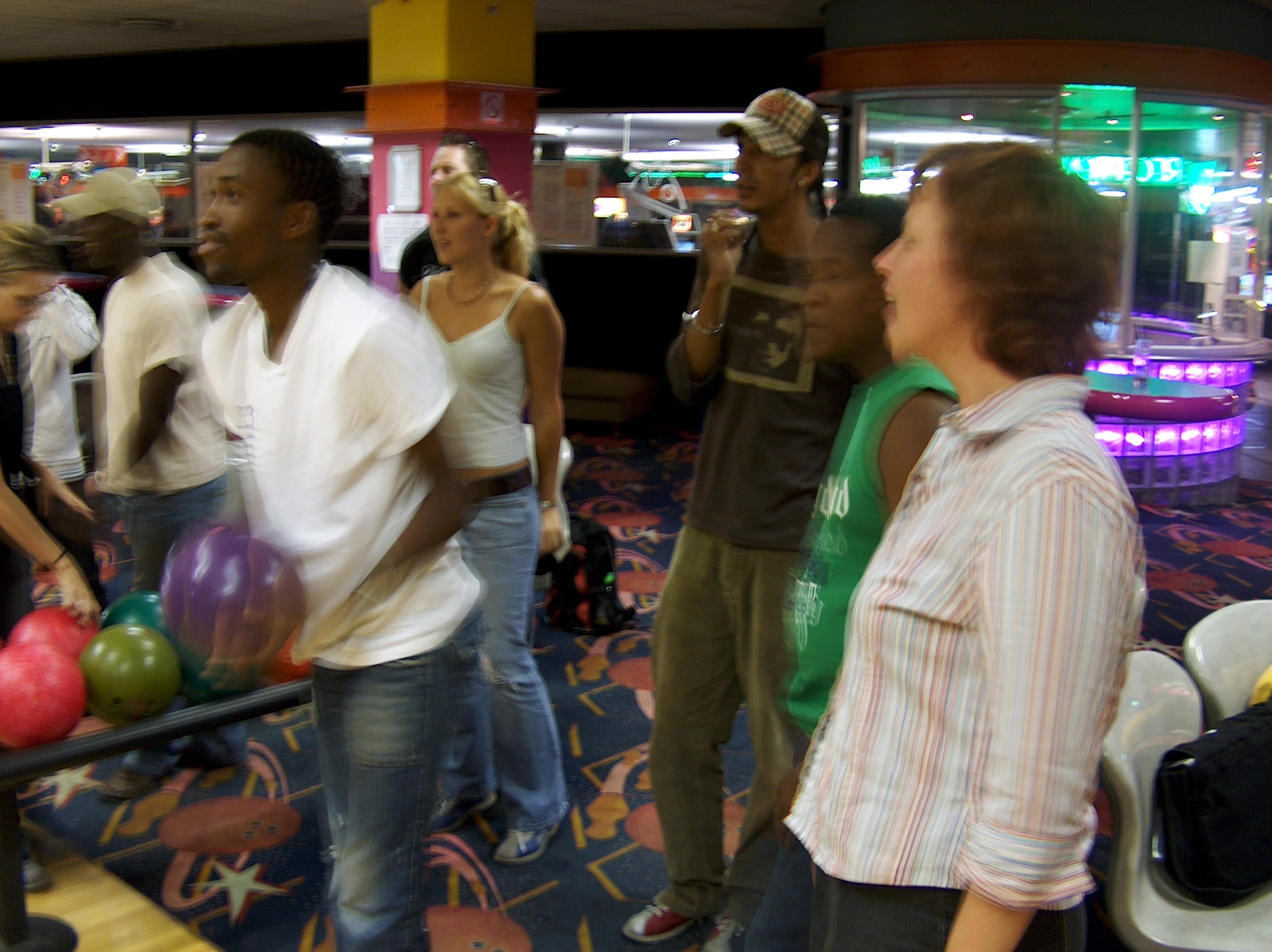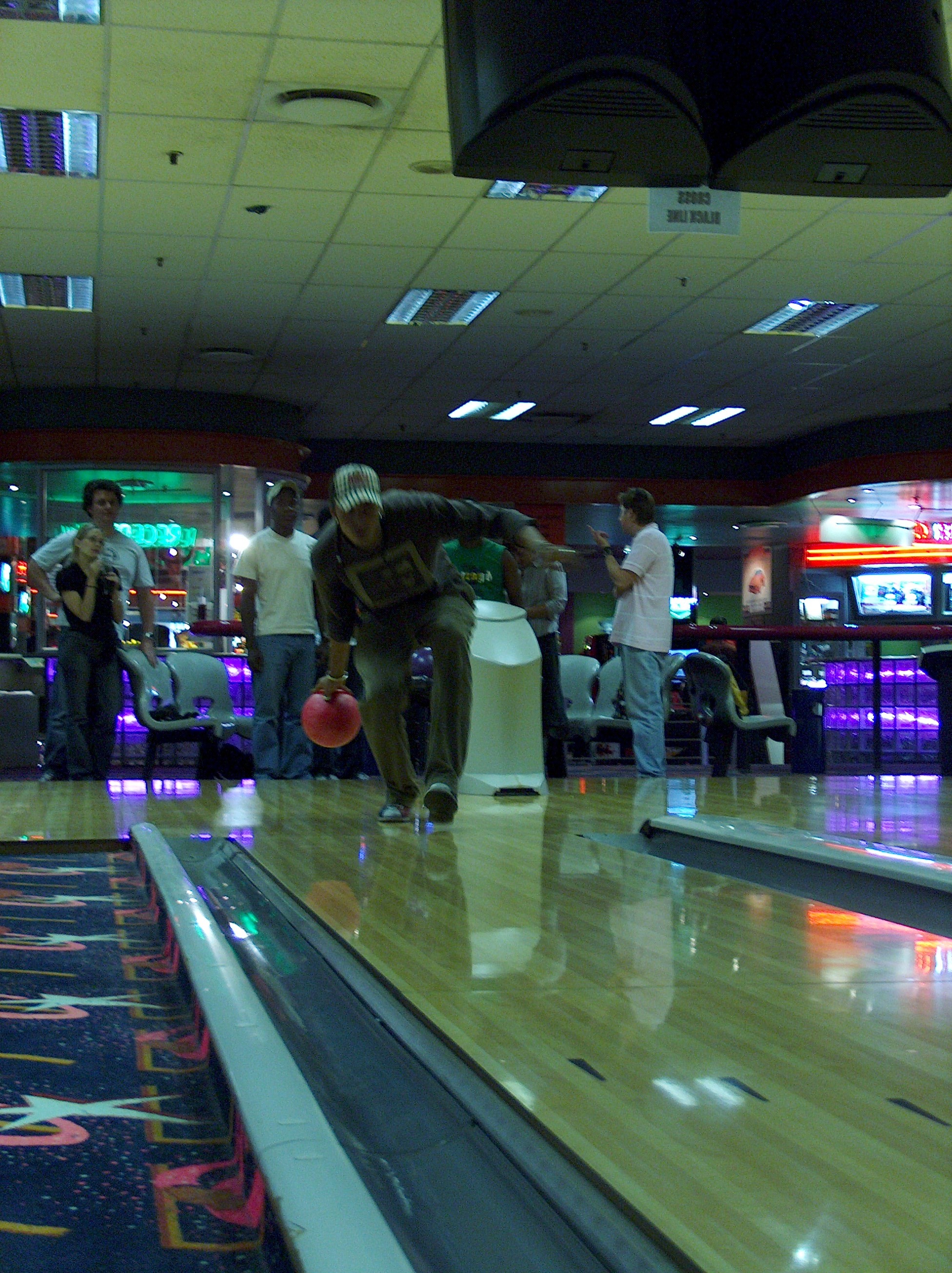 The bowling alley is inside an arcade in the Mall. The lighting is dim, and the environment is noisy, with the ambient sounds of pin’s falling and shooting games, and sudden bells ringing. There is a constant background hum of ‘musac’ to try softening the din created by all those arcade games. Upon arrival at the bowling alley, we were asked to perform several tasks, including purchase tickets at one counter and then receive “bowling shoes” from another counter, with the tickets we had just purchased. The receptionist divided the group into two, because there were too many of us to use just one alley. Interestingly, these two groups [created arbitrarily by the receptionist] at once behaved in competition with each other, even though we were not engaging in competitive sports.