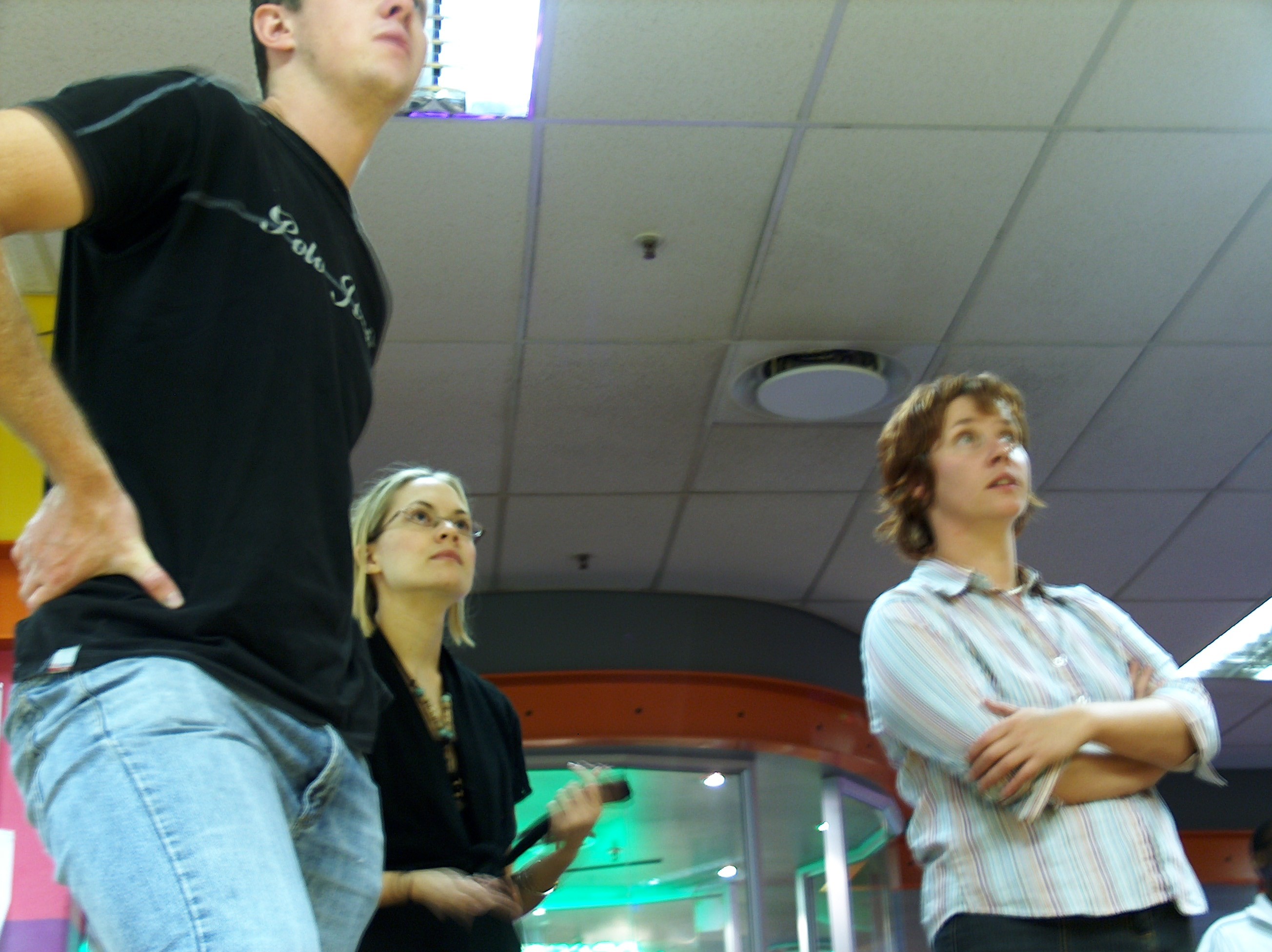 Throughout the session those not bowling conducted a discussion of the ideological formations present around us. Interesting points that were raised included noticing that we had disrupted the ideology of the class room through conducting our lesson in a bowling alley; that there were various devices employed to keep us in our group, and also homogenise the group; that much of the activities and procedures had to do with controlling our behaviour; that there are designated spaces in which certain kinds of behaviour are appropriate [for example that it is OK to run over pedestrians in a computer game but not in real life]. Some students had never been to the bowling alley before and said that they found it interesting that people go bowling at all. One student also said that he would never look at anything in the same way ever again having engaged in unpacking such a seemingly neutral space in terms of ideology and power.