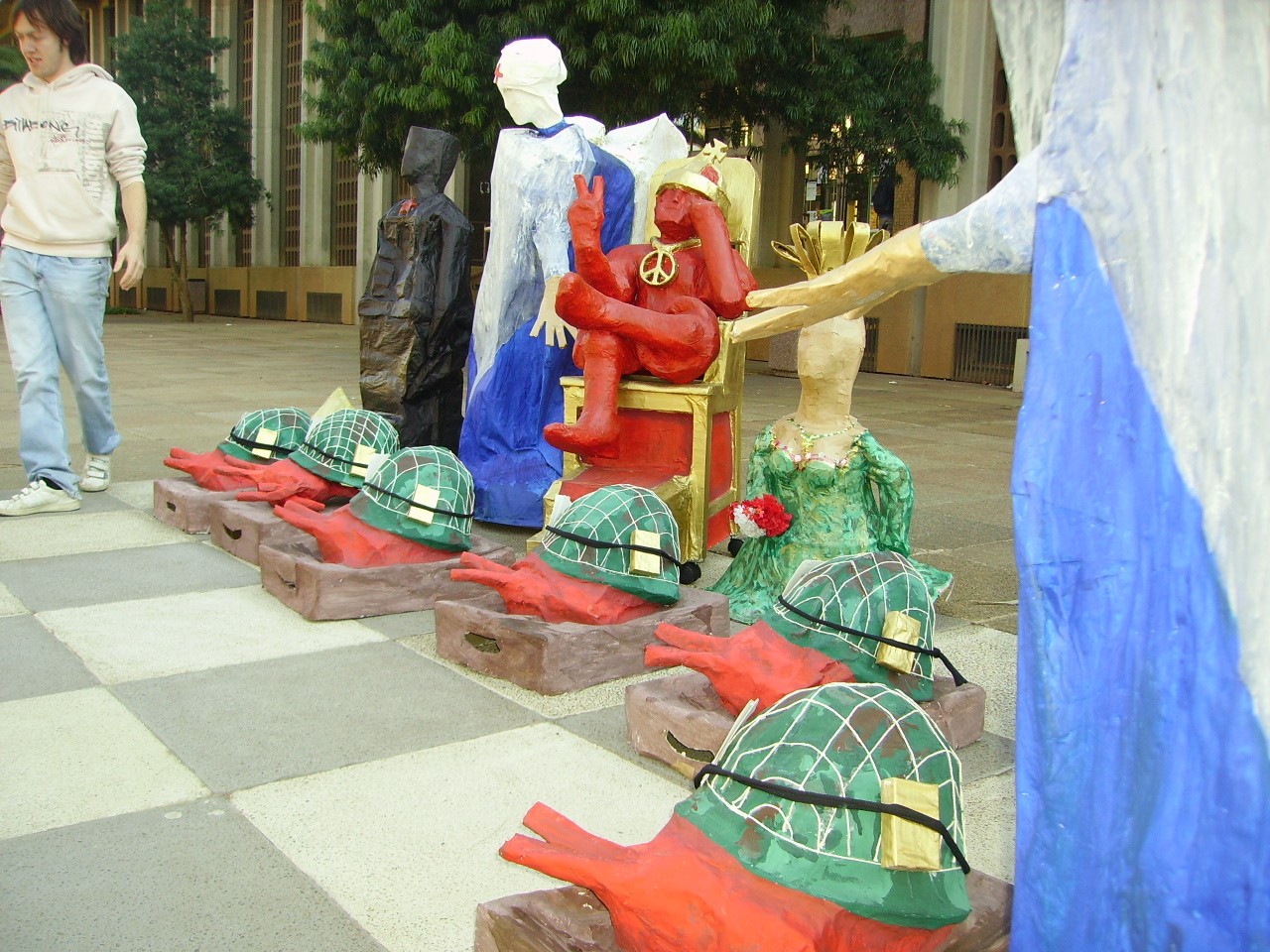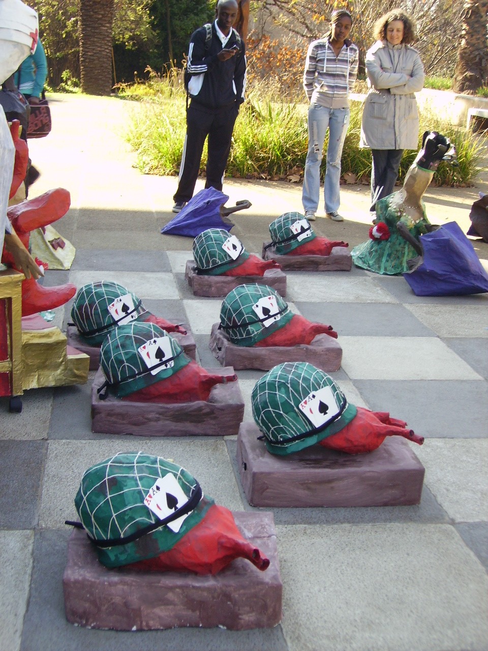 The result was a marvelous giant chess set, with pieces that referenced wonderland, and the absurd. We painted a chess board in the common area outside the campus library, inviting the university community to play chess with us as the project finale.