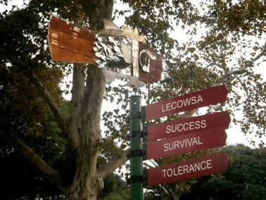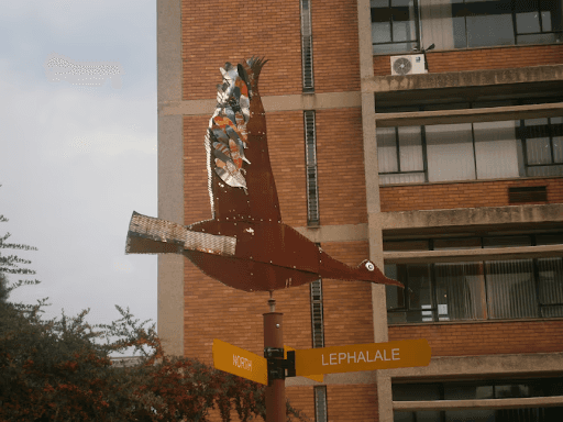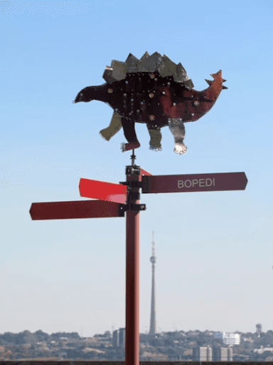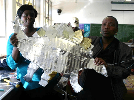 Students were required to work in groups to design and construct a site specific working weathervane from recycled metals for installation around the Wits School of Education campus in Johannesburg. Their designs had to be personally meaningful motif’s that were inspired by a story, and whose importance might resonate with the students and staff on the campus. Some students chose stories and symbol about learning, about knowledge and about overcoming difficulties, and perseverance- all things that associated with being at Wits. The use of multiple languages was an important aspect of the project. Students had to use visual language with visual design. They began with stories, made visual texts, and then added signs in different languages to the poles. They were communicating with different audiences. Students were encouraged to choose a direction, and make a sign to point to a place on campus, far away and also a metaphorical place. This is one of the levels in which their works were connected to local context and also extended beyond the local to connect to students own complex contexts. It was also a way for students to assert their own personal identities and languages in a space in which they often feel alienated, despite that the campus is for them- academic discourse is not anyone’s’ mother tongue.