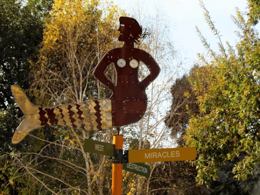 The project allowed us to explore the relation between the world of the classroom and the world of ‘real’ art making (asking questions about the relation between art practice and art pedagogies). There was also a symbolic relationship between the campus and the world out there because the signs pointed to places on campus and places beyond the campus. We also collaborated with several professionals at different stages of the project. We found that through the multiple collaborations in this project that working in a collaborative manner in the art classroom disrupts notions of the art teacher as pedagogue. We extended this by designing a project in which we were not expert makers- but drew on expertise around us. Drawing on local art practices. In doing this we modelled practice as art teachers- art as collaborative project in which you can work with range of experts.